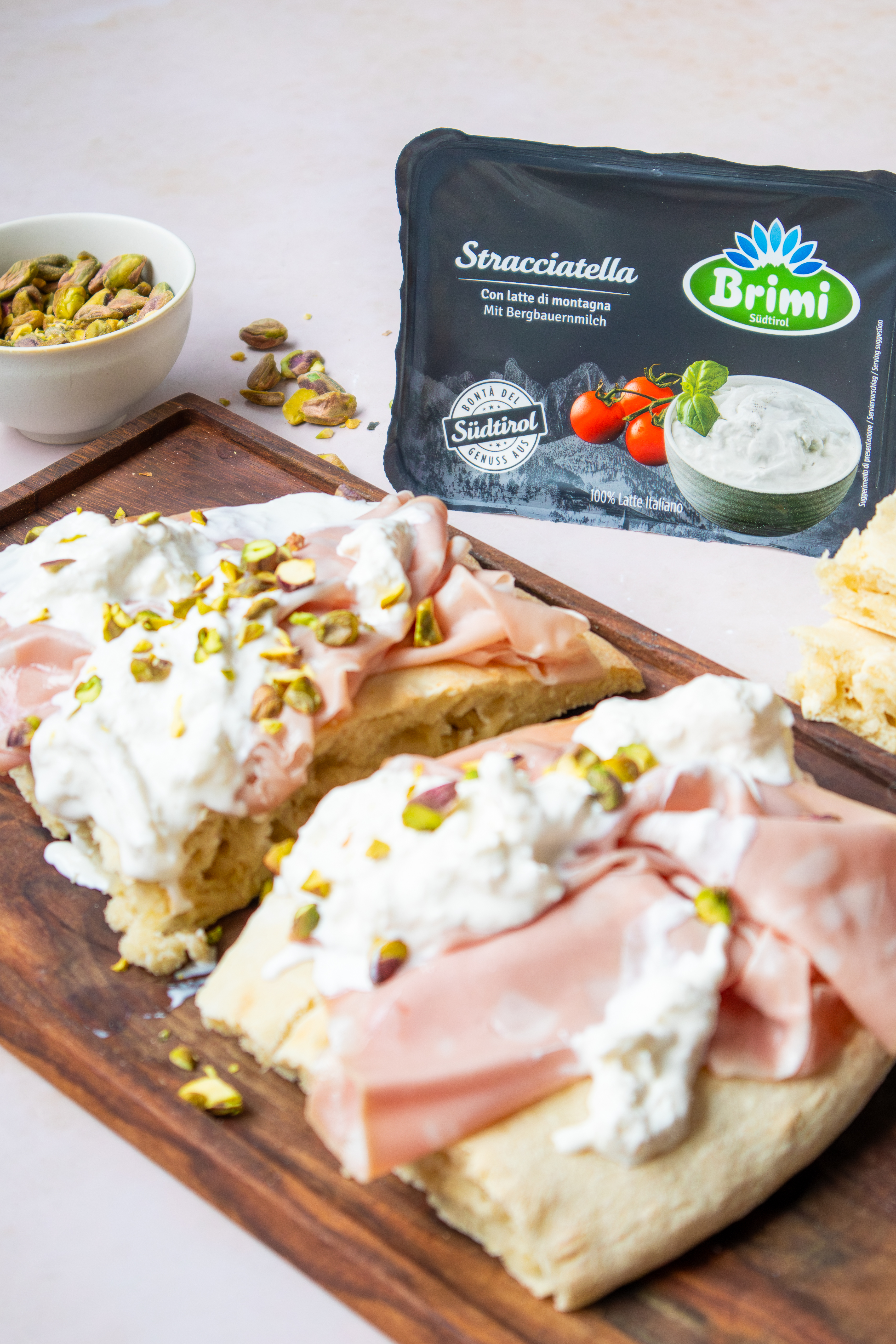 Anschließend mit Mortadella, Stracciatella und Pistazien belegen und lauwarm oder kalt servieren.